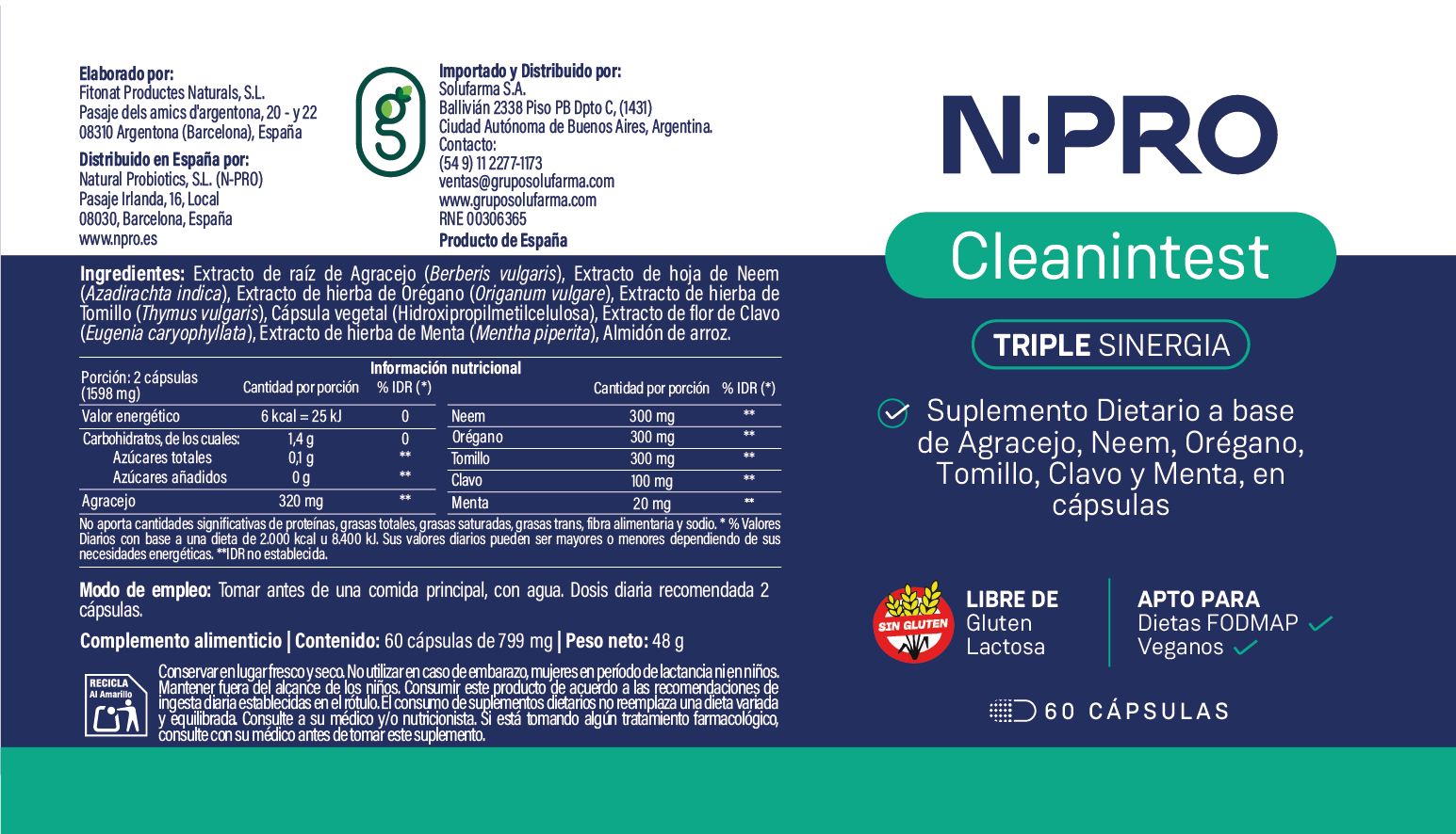 Extracto seco de raíz de agracejo (Berberis vulgaris, 97% berberina), extracto seco de hierba de orégano (Origanum vulgare, 20% carvacol, 20% polifenoles), extracto seco de hierba de tomillo (Thymus vulgaris, 10% timol), extracto seco de hoja de neem (Azadirachta indica, 7% sustancias amargas), agente de recubrimiento (hidroxipropilmetilcelulosa), extracto seco de flor de clavo (Syzygium aromaticum, 10:1), extracto seco de hierba de menta (Mentha piperita, 10% polifenoles), almidón de arroz.