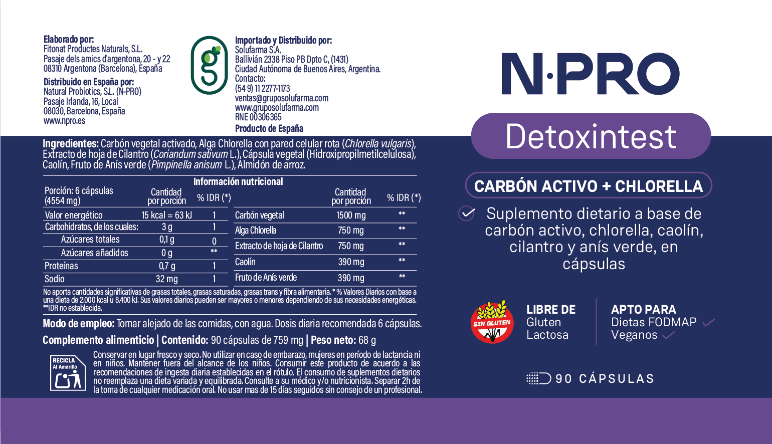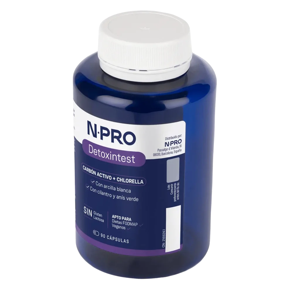 NPro Detoxintest es un producto formulado a base de carbón vegetal, arcilla blanca, clorela y plantas como cilantro y anís verde.