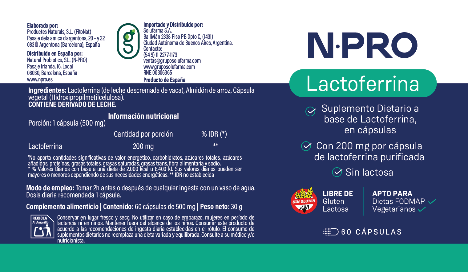 Lactoferrina, Almidón de Arróz y Capsula Vegetal.