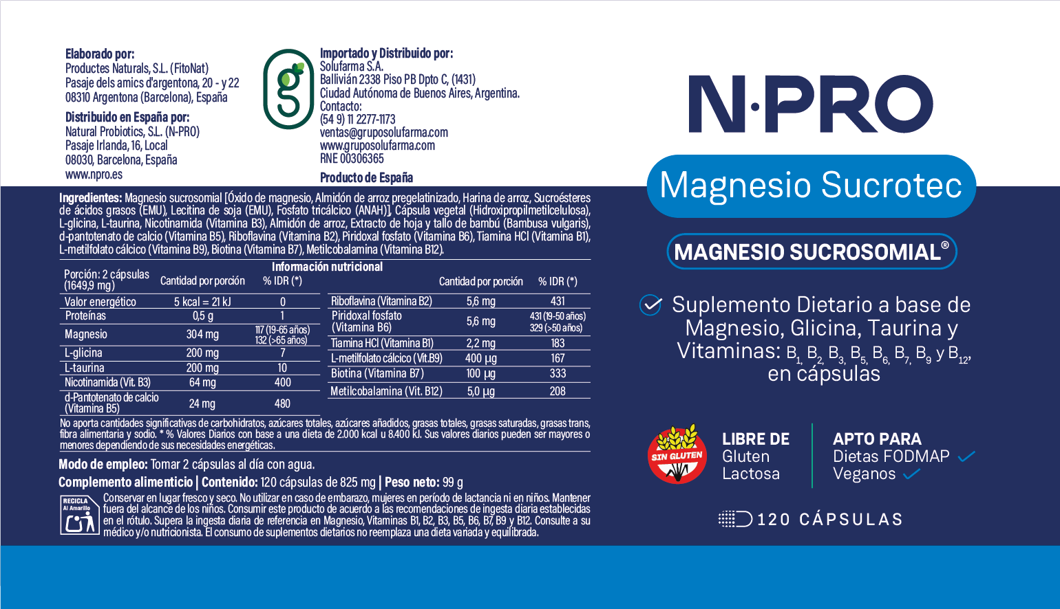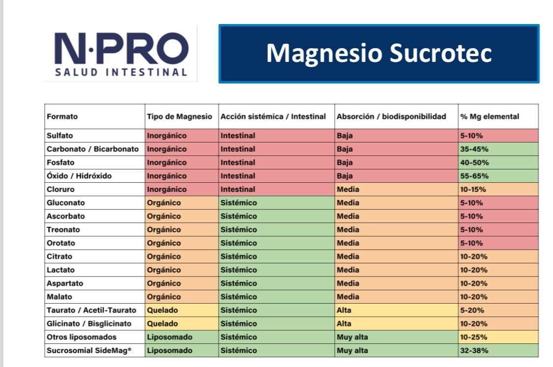 NPro Magnesio Sucrotec aporta magnesio microencapsulado fabricado con un sistema de liberación sucrosomial patentado para mejorar la absorción del magnesio. Además, aporta los principales cofactores implicados en las reacciones químicas en las que participa el magnesio.